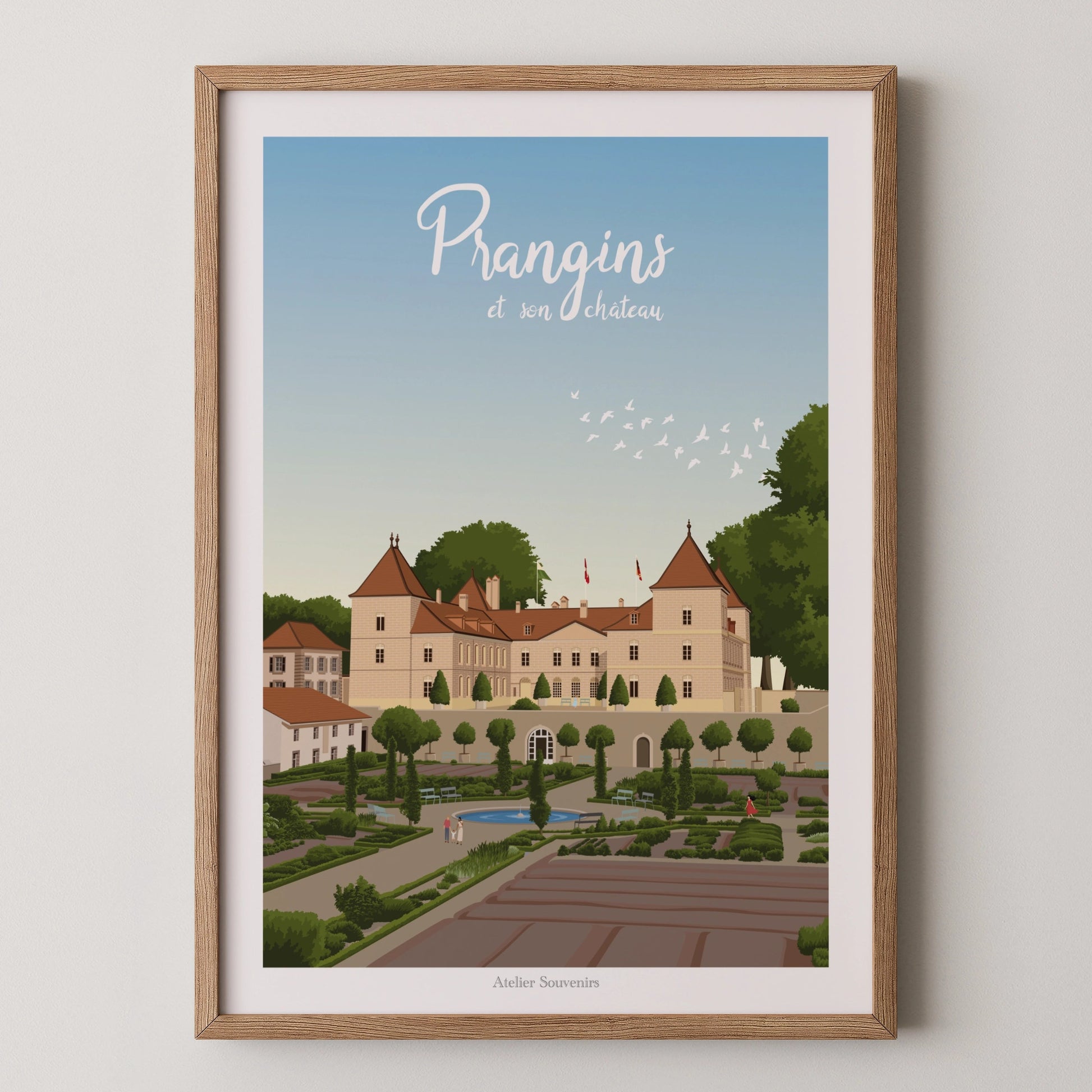 Plongez dans l’élégance paisible de la Côte vaudoise avec cette affiche exclusive d’Atelier Souvenirs. Cette illustration met en scène le château de Prangins, joyau historique surplombant le lac Léman, entouré de ses jardins à la française soigneusement dessinés. Une scène lumineuse et harmonieuse qui capture le charme intemporel de ce lieu emblématique du canton de Vaud.